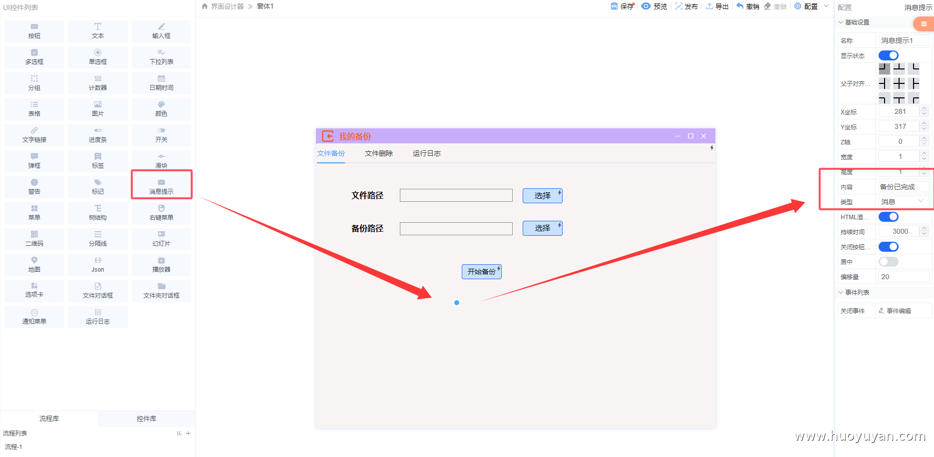 组件3:控件函数调用 ,使用控件函数调用,打开备份已完成的消息通知