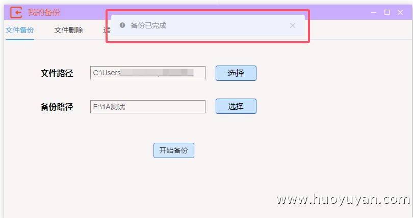 用户点击"选择"按钮→触发系统文件夹对话框→选中路径自动赋值到对应的输入框,点击 开始备份 / 确定删除按钮→触发绑定的后台自动化流程,实现操作指令的可视化触发。