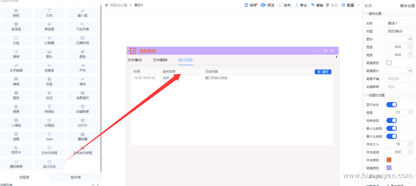 本案例包含 文件备份 文件删除 运行日志 3 个选项卡,通过拖拽控件完成布局,具体操作如下:
