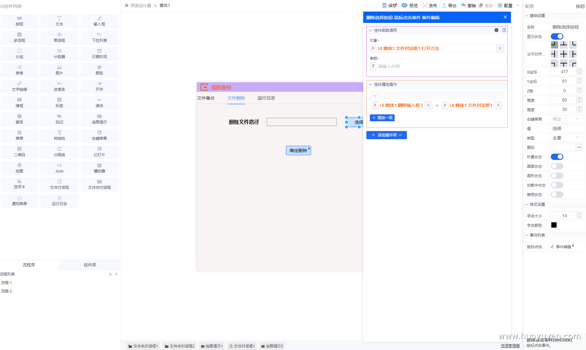 组件2:控件属性操作, 对删除文件路径进行赋值,变量删除文件路径=UI.窗体1.删除输入框.值
