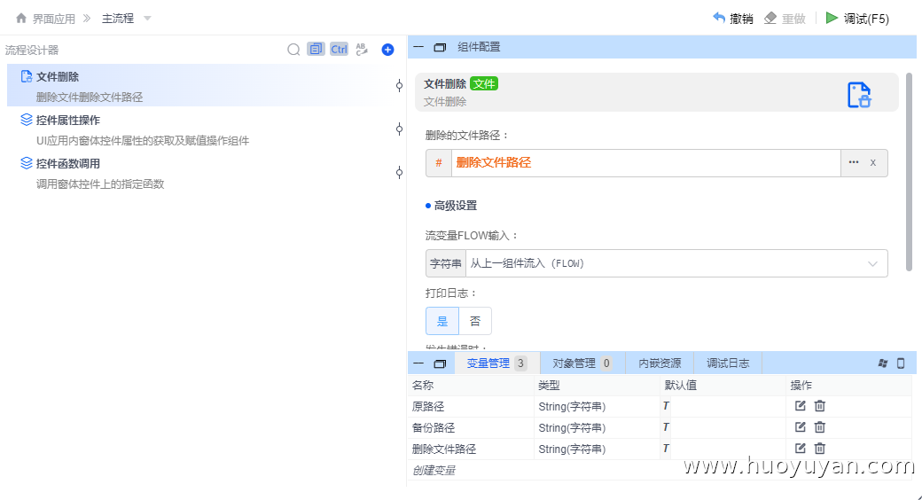 组件1:文件删除组件 ,设置变量删除文件路径,在删除文件路径中,写入变量