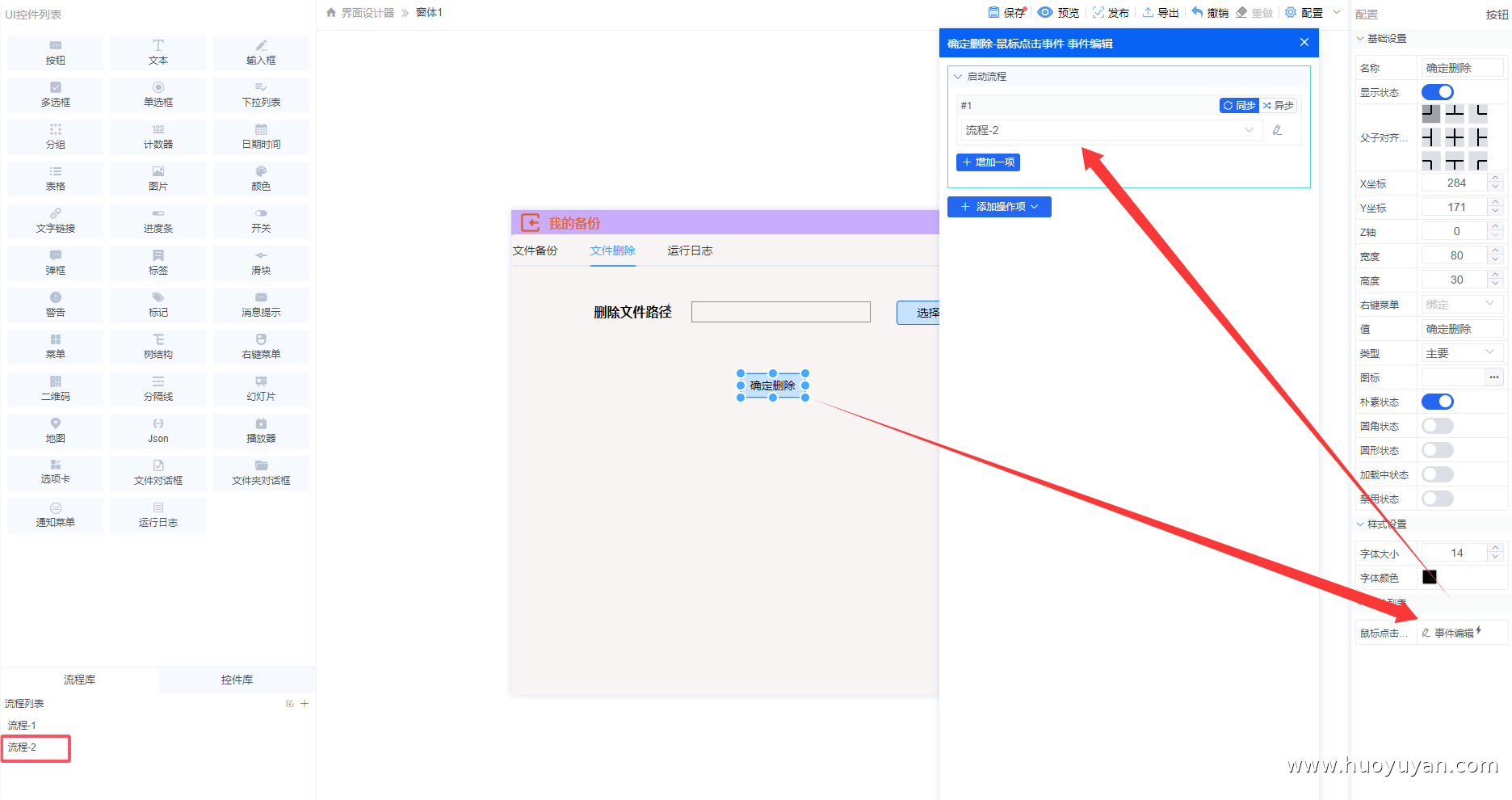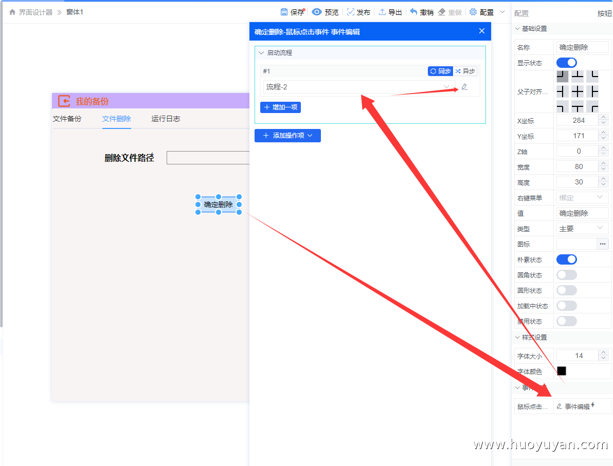 设置确定删除按钮,将该按钮与流程2事件绑定,触发按钮点击时即可完成自动备份操作。