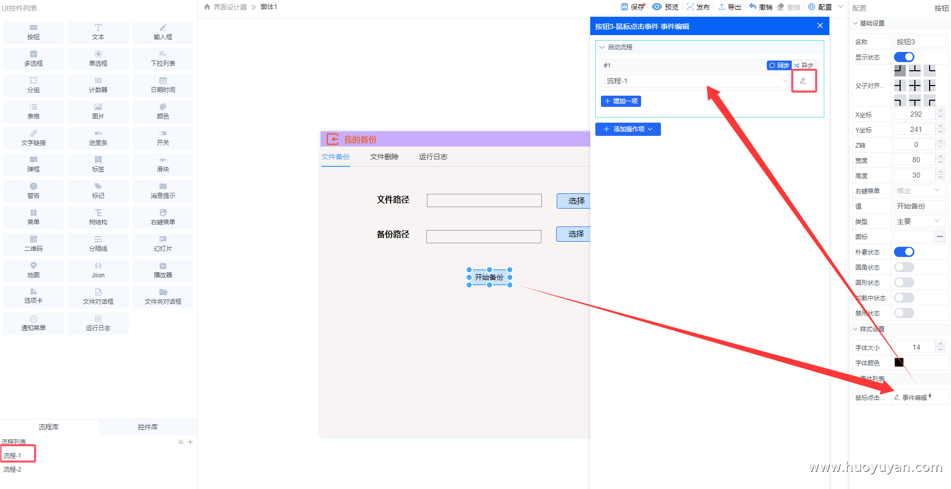 设置开始备份按钮,将该按钮与流程1事件绑定,触发按钮点击时即可完成自动备份操作。