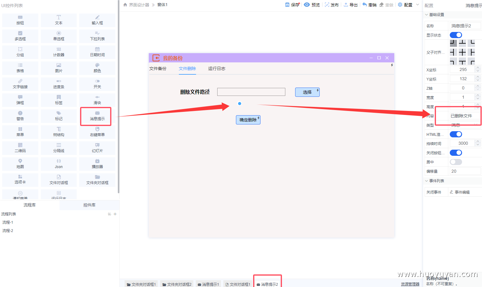 组件3:控件函数调用 ,使用控件函数调用,删除完成后弹出删除已完成的消息通知