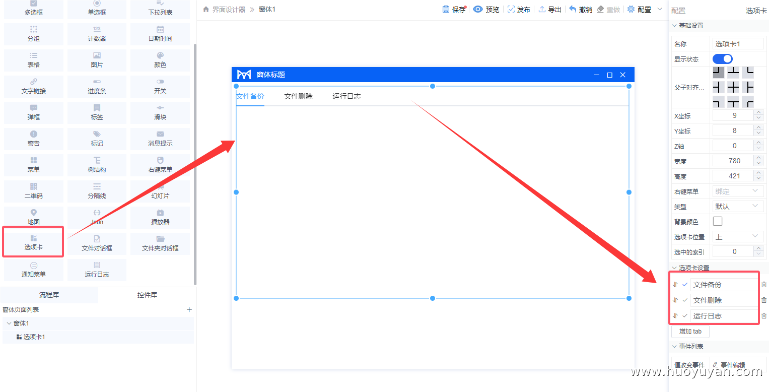 从左侧【UI控件列表】面板拖拽【选项卡】至界面设计器,右键点击选项卡,依次将 3 个默认标签重命名为 文件备份 文件删除 运行日志。