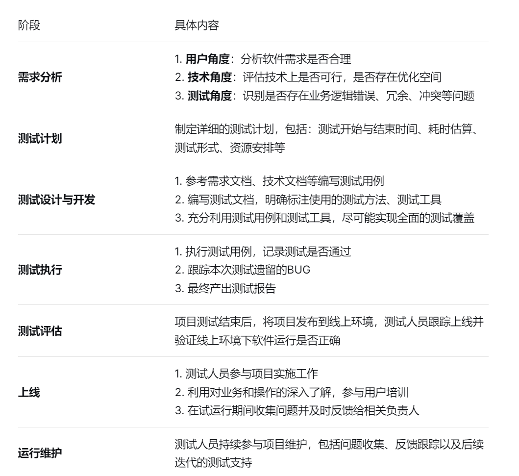 软件测试的生命周期是指测试流程,这个流程是按照⼀定顺序执行的一系列特定的步骤,去保证产品质量符合需求。在软件测试生命周期流程中,每个活动都按照计划的系统的执行。每个阶段有不同的目标和交付产物。