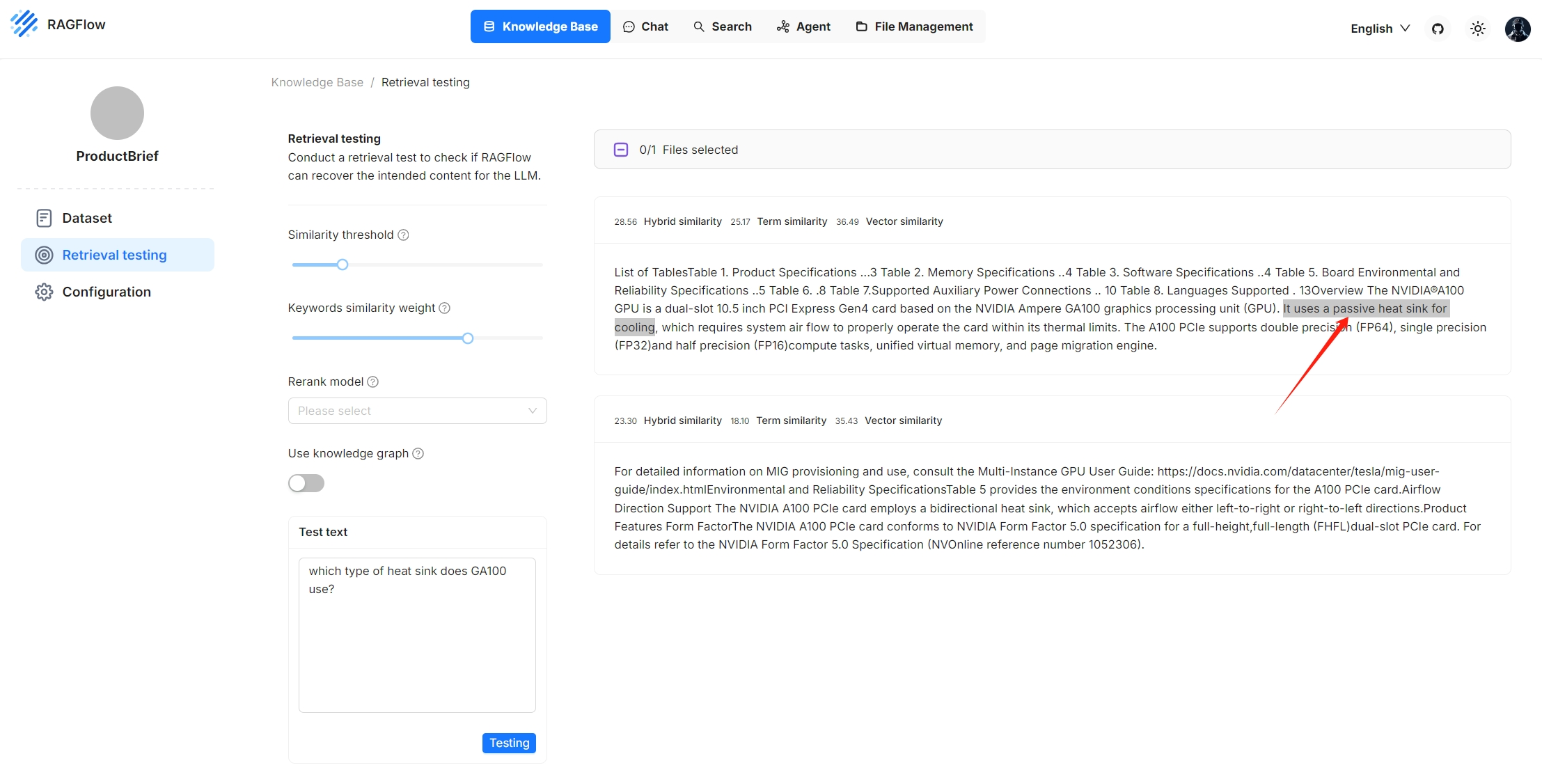 在检索测试期间,使用混合搜索检索根据您指定的分块方法创建的块。此搜索结合了加权关键词相似性和加权向量余弦相似性或加权重排分数,具体取决于您的设置: