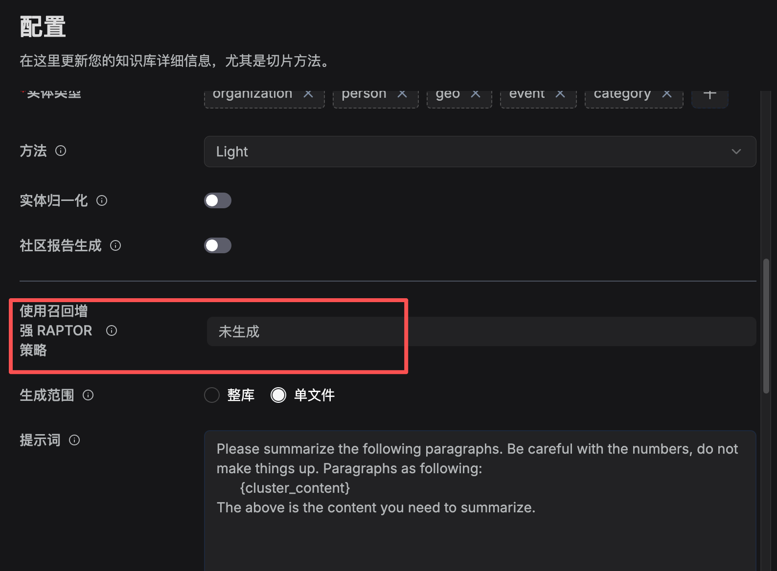 - 轻量Light:(默认)使用 LightRAG 提供的提示提取实体和关系。此选项消耗更少的令牌、内存和计算资源。