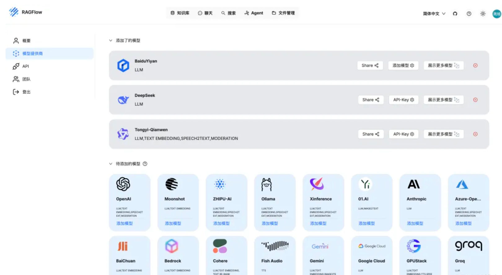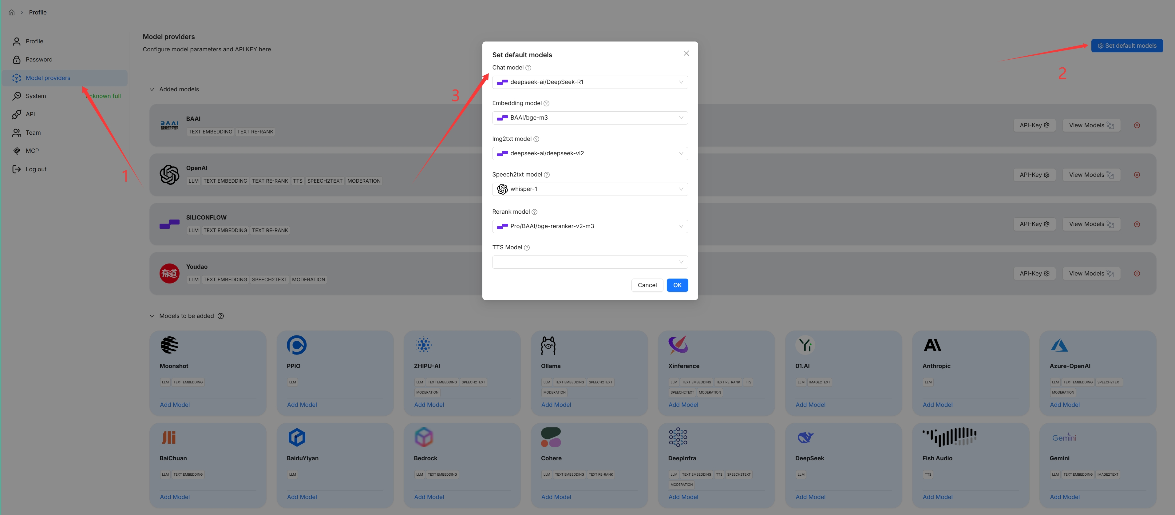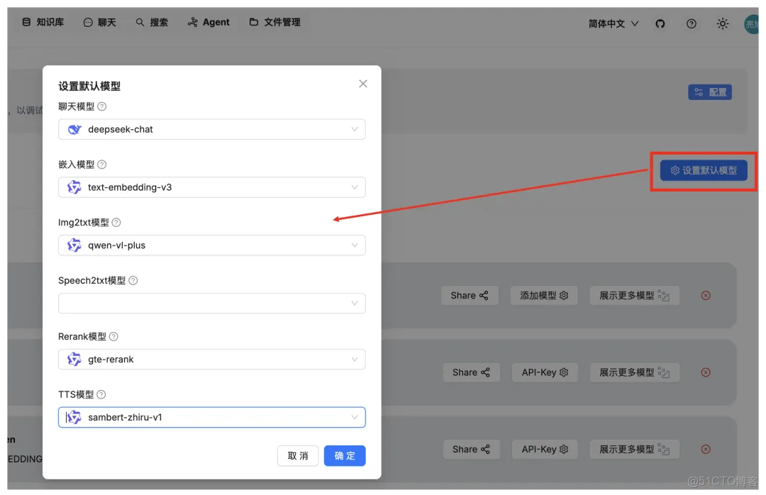 系统的默认聊天模型用于生成知识图谱。在继续之前,请确保您已正确配置聊天模型: