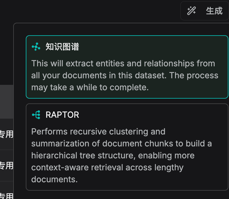 导航到数据集的文件页面,单击页面右上角的生成按钮,然后从下拉菜单中选择 RAPTOR 以启动 RAPTOR 构建过程。