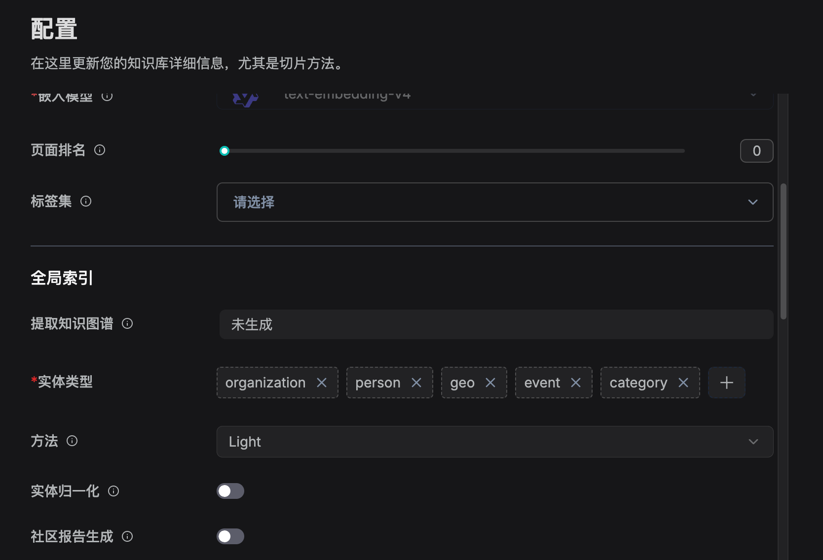 在知识图谱中,社区是通过关系链接的实体集群。您可以让 LLM 为每个社区生成摘要,称为社区报告。有关更多信息,请参见此处。此选项指示是否生成社区报告: