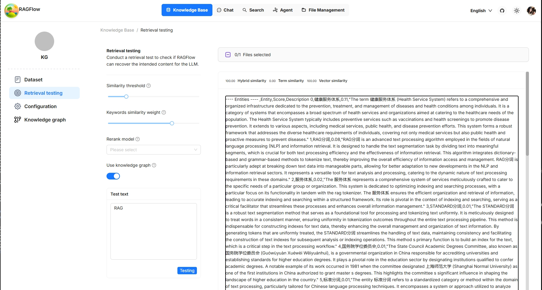 以下是未使用知识图谱进行的检索测试的屏幕截图。它演示了结合了加权关键词相似性和加权向量余弦相似性的混合搜索。整体混合相似度得分为 28.56,计算方式为 25.17(术语相似度得分)x 0.7 + 36.49(向量相似度得分)x 0.3
