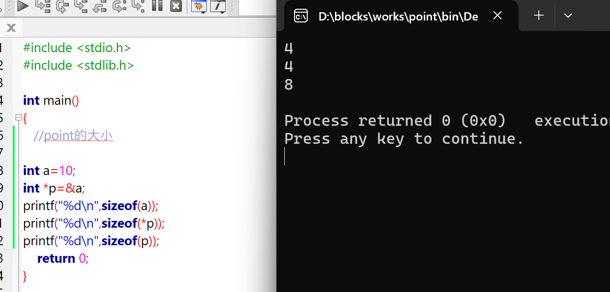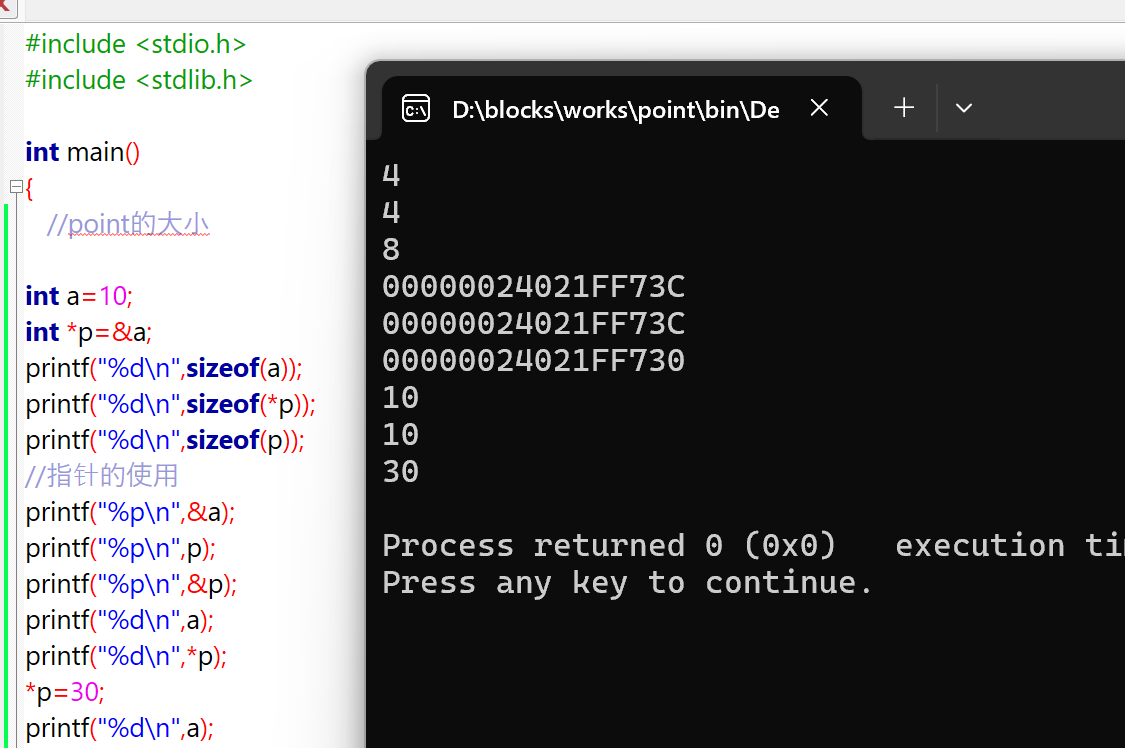 然后我们 int *p=&a;这里用到了取地址符&,因为p储存的是a的地址嘛;我认为要 int (*p)的原因,是p存储a的地址,*p就相当于把他转化成了整型;或者说p是指针,不是整型,而*p是p指向的内容,这个内容是整型(10)(下面是64进制条件下)