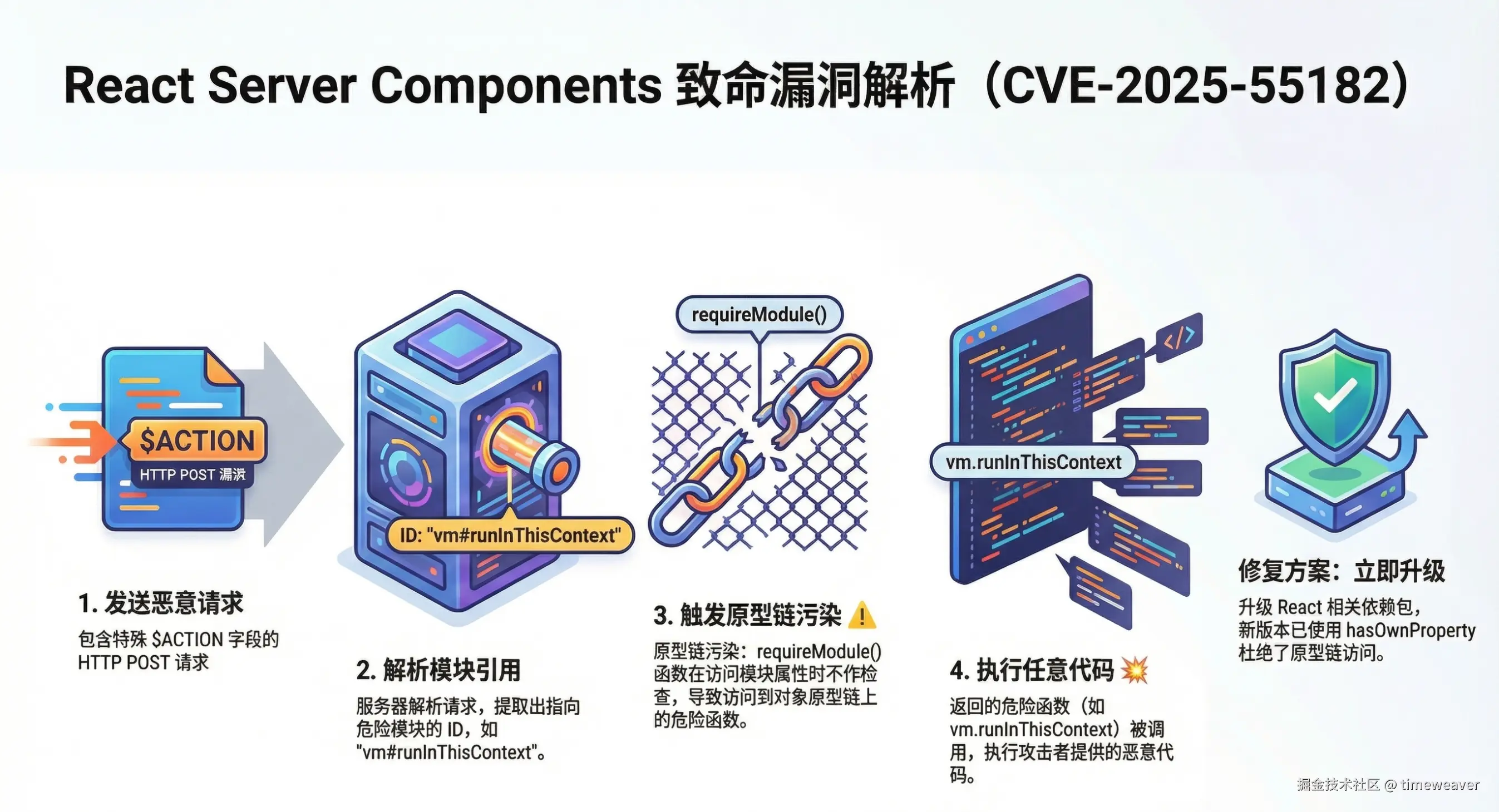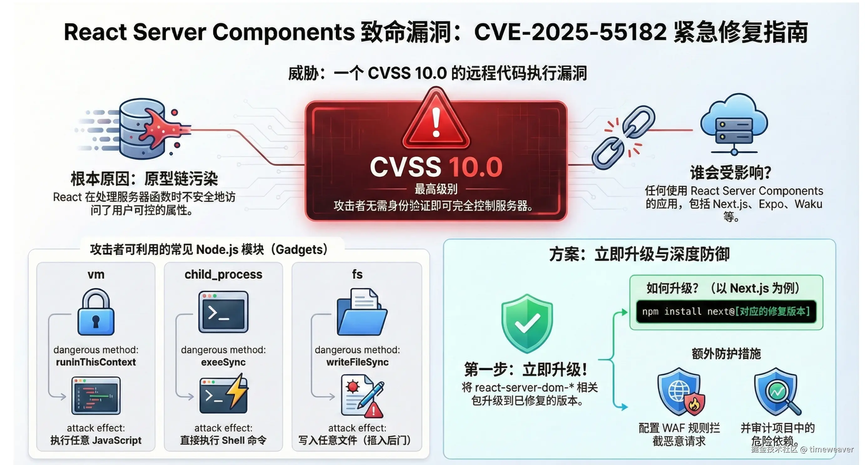 - 2025年12月3日:修复发布到 npm,公开披露为 CVE-2025-55182