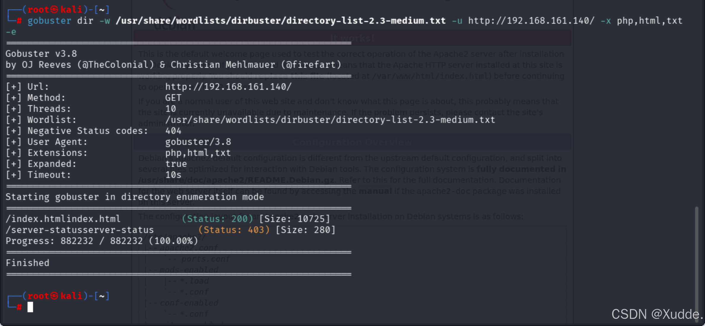 gobuster dir -w /usr/share/wordlists/dirbuster-list-2.3-medium.txt -u http://192.168.161.140/ -x php,html,txt -e