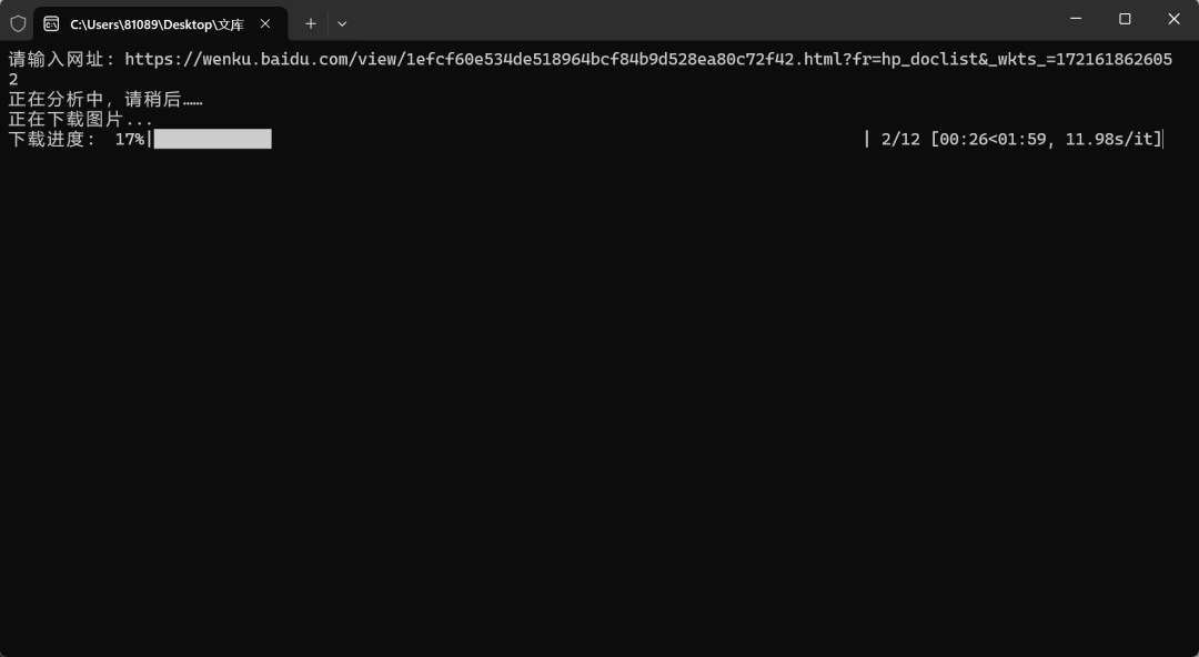 软件打开以后是一个交互式的界面,把需要下载的文库网址输入到软件中,然后回车即可。