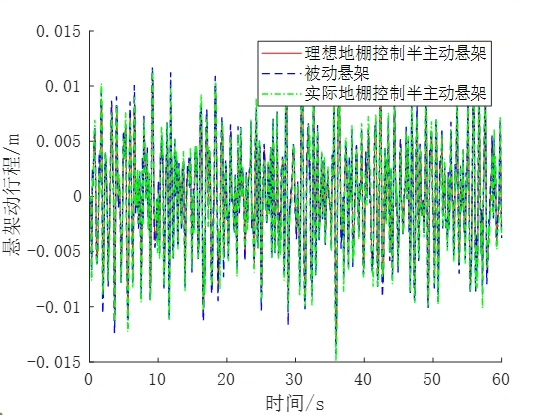 最后给个调参小技巧:先固定C_sky=2000N·s/m,观察相位差是否在10度以内。再根据悬架行程限制调整,比如当动挠度超过50mm时,适当降低阻尼系数防止触底。模型里加个饱和模块就能实现:
