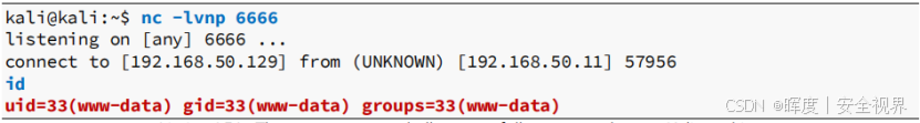 192.168.50.129)上开启netcat监听器:bash$ nc -nlvp 6666