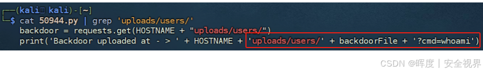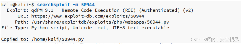 searchsploit工具将公开的漏洞利用代码 50944.py 复制到当前工作目录。