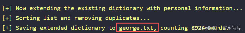 pass123george pass123geo pass123AIDevCorp pass1231208 pass1231985p@ss123 p@ss123george p@ssw0rd p@ssw0rdAIDevCorp @dm1n @dm1ngeopass123! georgepass123 AIDevCorp2023 geo1208 developer85输出增强的字典文件: george.txt,包含了8924个密码。为了规整,把george.txt重命名回password_list.txt 。