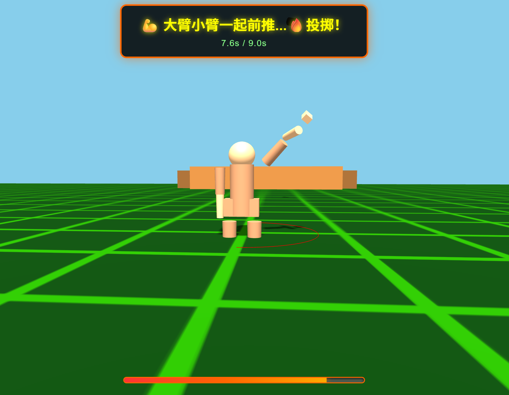 其次是进度条,位于屏幕下方,以视觉化的方式表示整个投掷周期的进度。进度条的宽度随着时间的推移而增加,从0%增长到100%,然后重置。进度条使用了渐变颜色(从红色#ff3333到橙色#ff6600到黄色#ffaa00),增强了视觉吸引力。进度条本身也有一个发光效果(box-shadow),进一步强化了动态感。