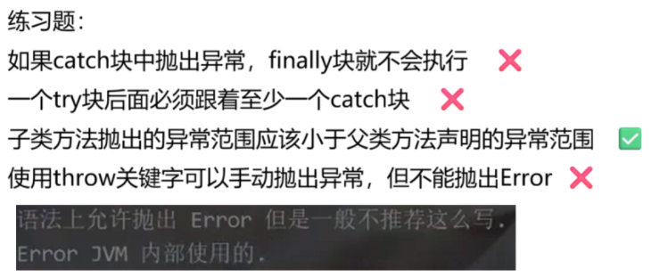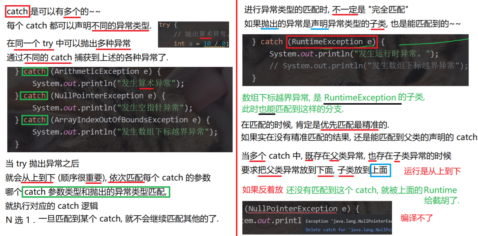 (5)如果异常 之间具有父子 关系,catch中一定是子类异常在前 ,父类异常在后,否则语法错误。
