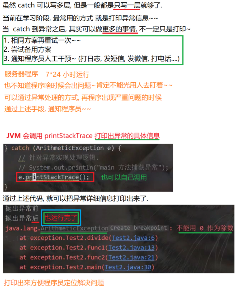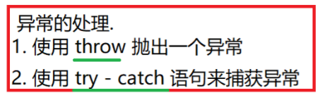 异常的捕获 ,也就是异常的具体处理方式 ,主要有两种 :异常声明 throws 以及try-catch捕获处理。