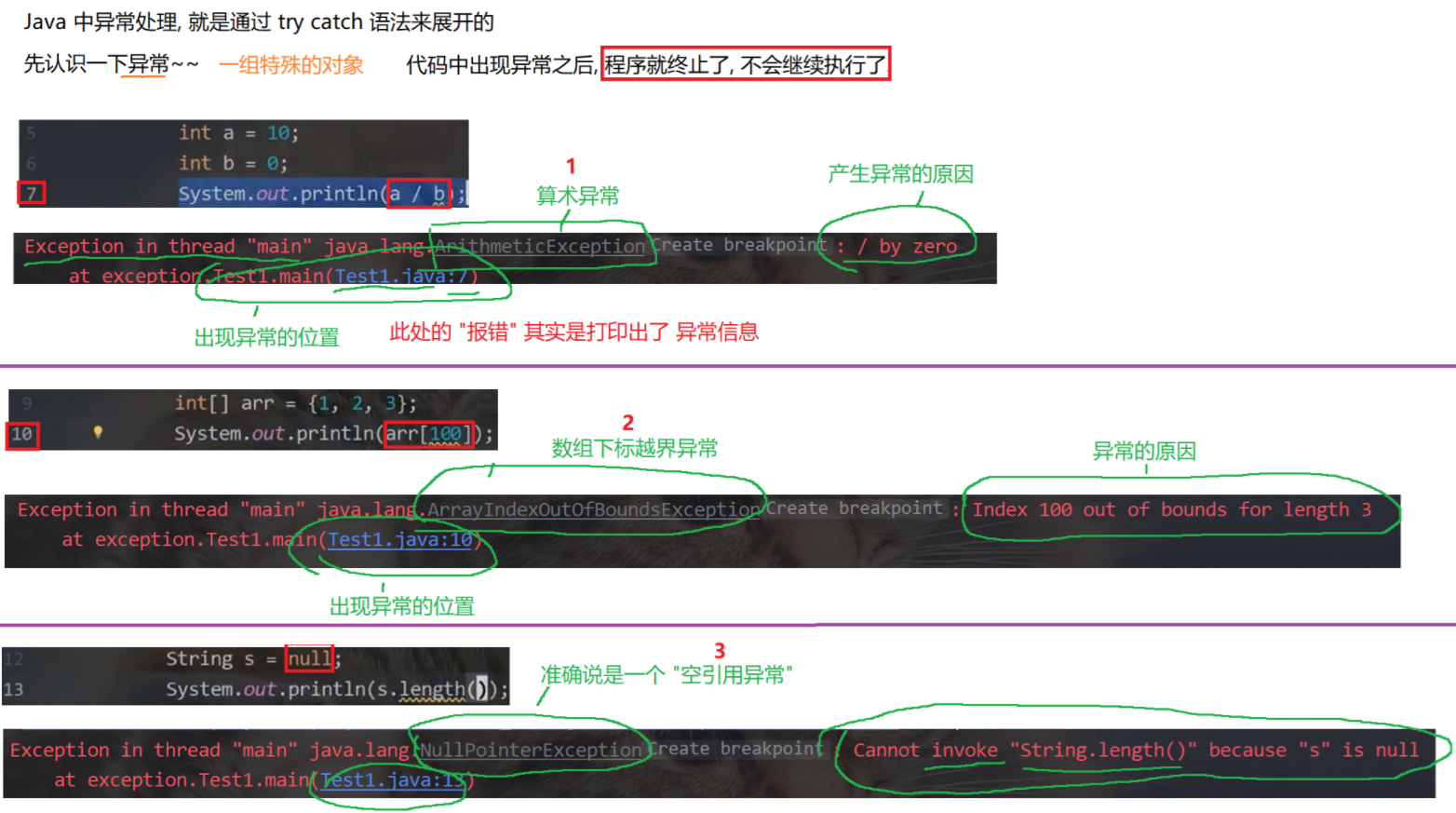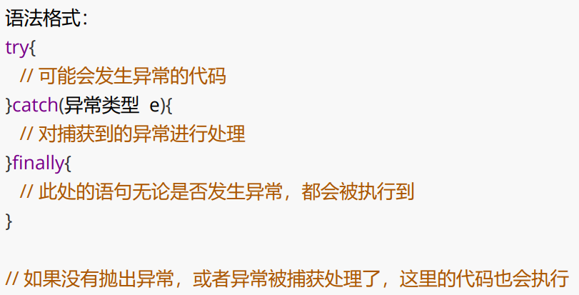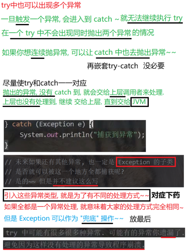 (3)try中可能会抛出多个 不同的异常 对象,则可以用多个 catch 来捕获 ----即多种异常,多次捕获(try-catch尽量一一对应)。