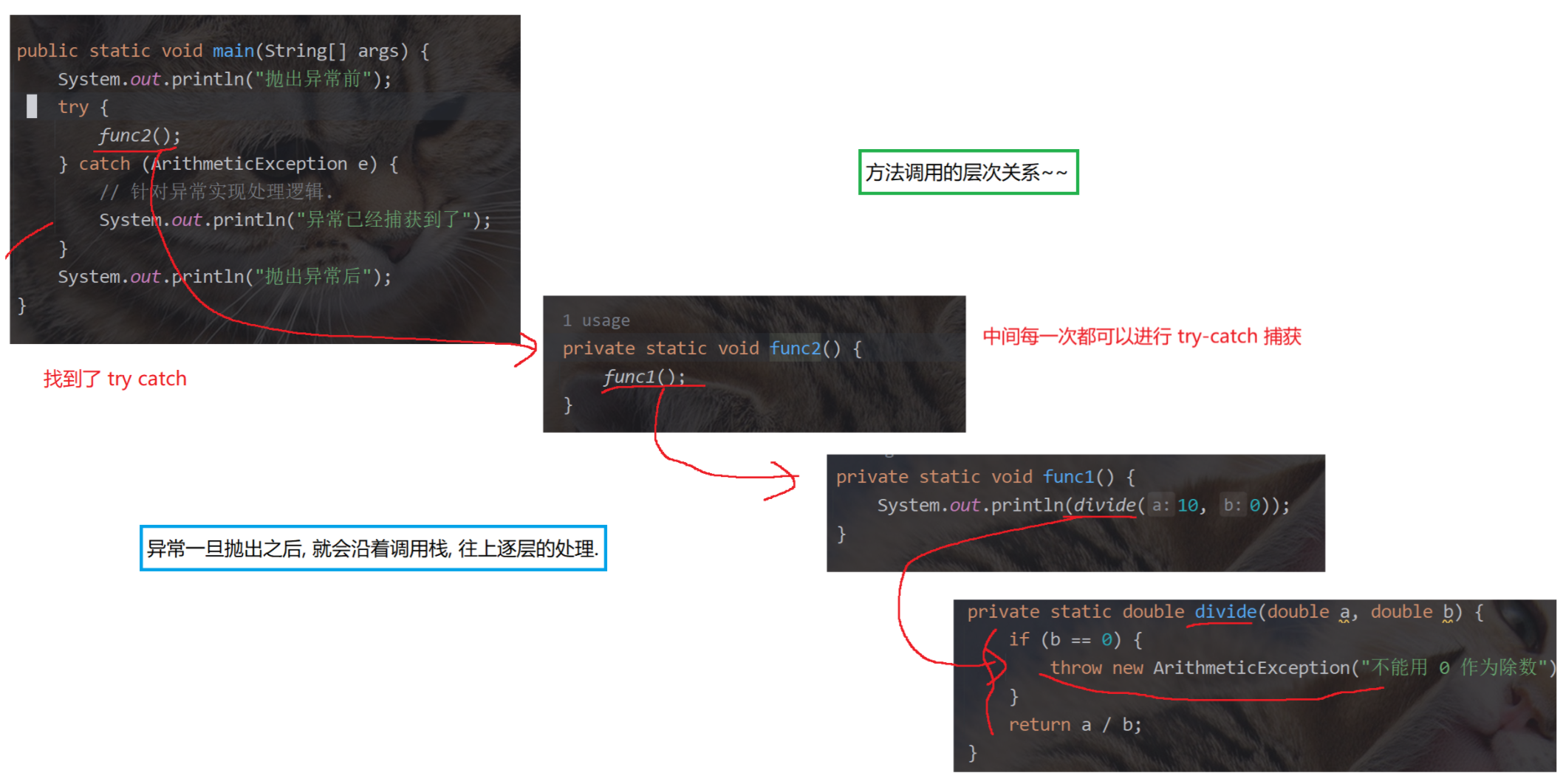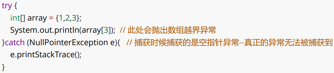 (2)如果抛出异常类型 与 catch 时异常类型不匹配 ,即异常不会被成功捕获 ,也就不会被处理 ,继续往外抛(方法的调用者 ),直到 JVM 收到后中断程序----异常是按照类型来捕获的。