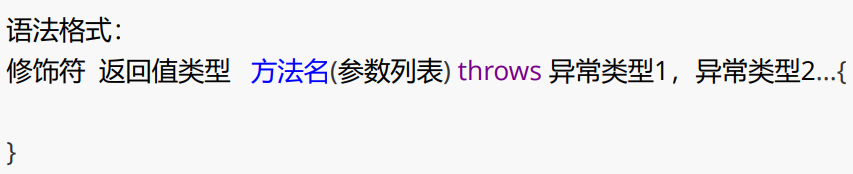 处在方法声明时参数列表之后,当方法中抛出编译时异常,用户不想 处理该异常,此时就可以借助 throws 将异常抛给方法的调用者 来处理。即当前方法不处理异常,提醒方法的调用者处理异常。