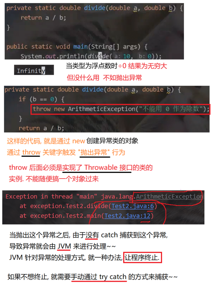 throws 对异常并没有真正处理 ,而是将异常报告给抛出异常方法的调用者 ,由调用者 处理。如果真正要对异常进行处理,就需要try-catch。