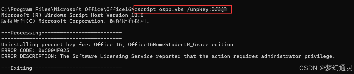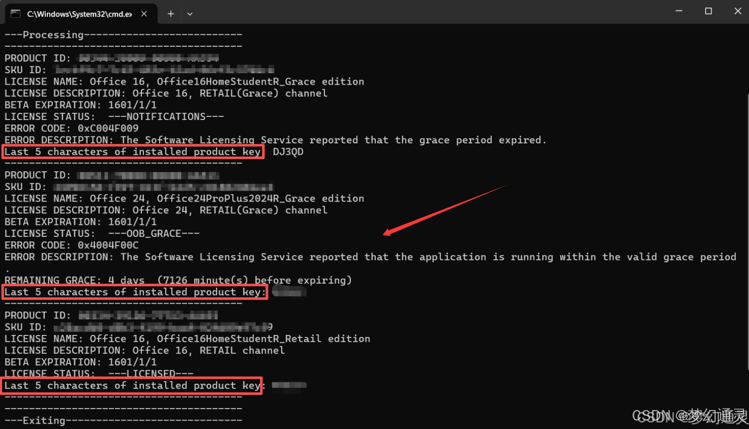 ospp.vbs /dstatus 是 Office 软件保护平台脚本(Office Software Protection Platform Script)中的一个常用命令,用于查看当前已安装产品密钥的许可证信息,包括版本、激活状态、剩余宽限期等。