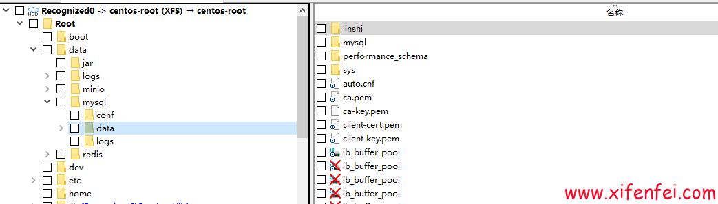 今天有一个客户在在虚拟机环境中使用drop database删除一个业务mysql的库,删除之后,第一时间关闭了该虚拟机系统.接到该case请求之后,让客户提供了虚拟机文件(vmdk),通过工具分析,mysql数据库是放在/分区下面的/data里面(lvm结构,xfs文件系统),但是已经看不到他们删除的数据库(mysql一个库对应一个目录)