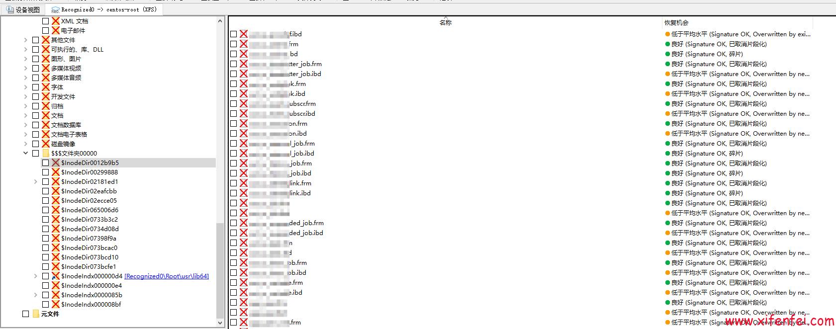 对于这种情况,我们第一步尝试文件系统层面反删除恢复(对数据库所在分区进行文件系统层面扫描,尝试恢复被删除的mysql表文件),运气不错,找到了一些被删除库的ibd文件