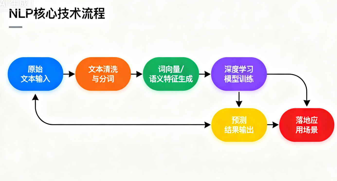 图 2:NLP 核心技术流程(从原始文本到落地应用的全链路)