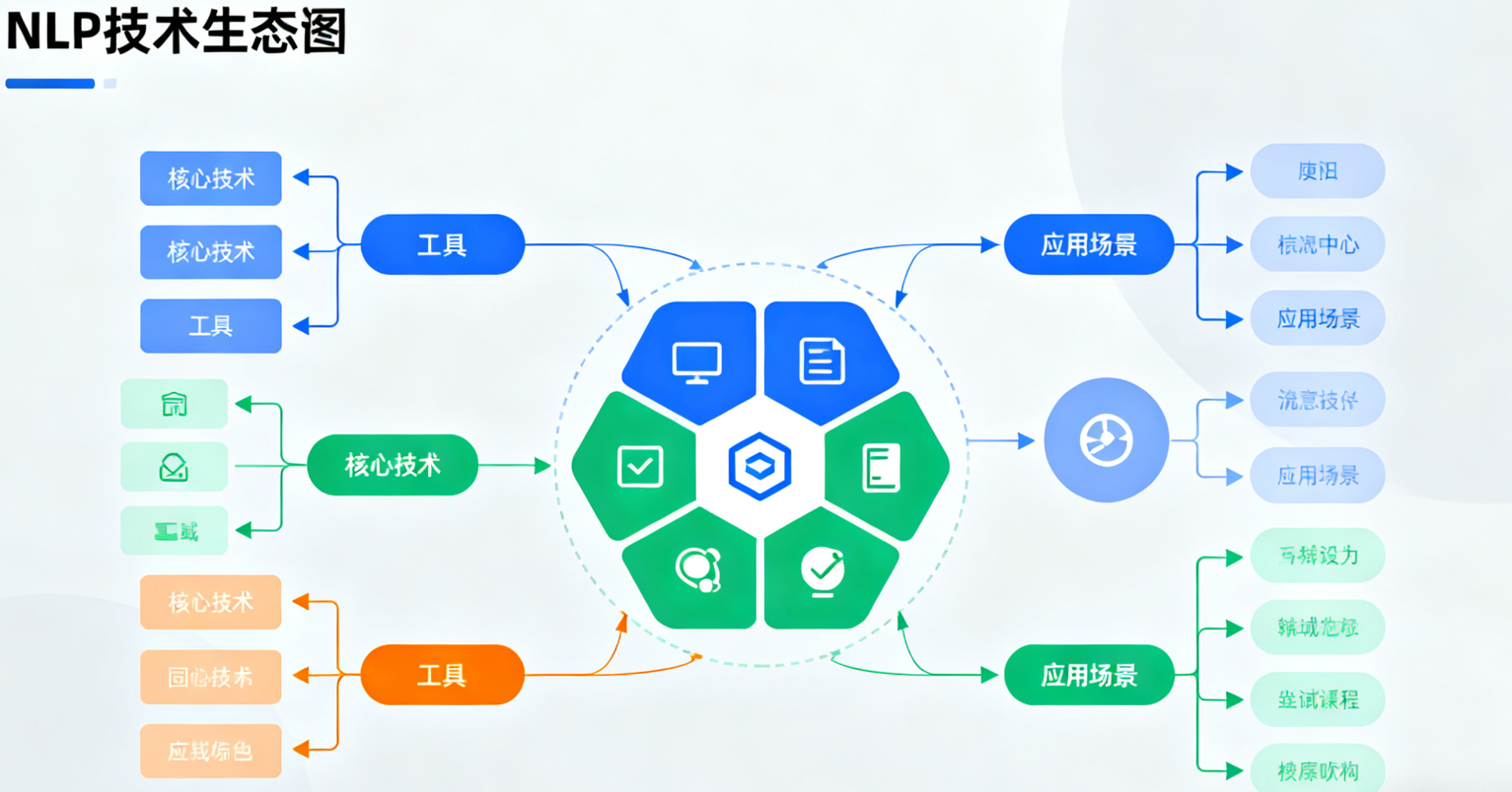 图 1:NLP 技术生态图谱(核心技术、工具、应用场景的关联关系)
