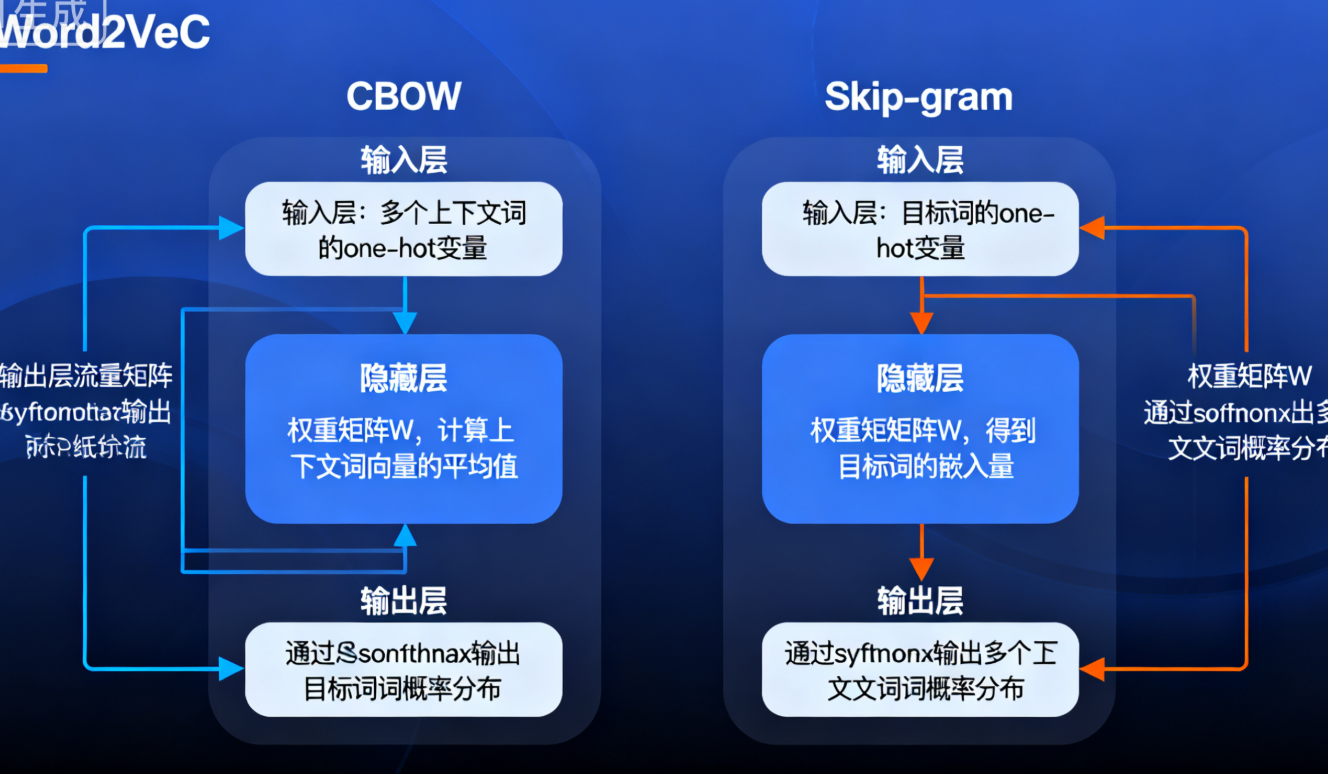 Word2Vec 的核心思想是 "分布式假设":上下文相似的词,语义也相似。其两个核心模型: