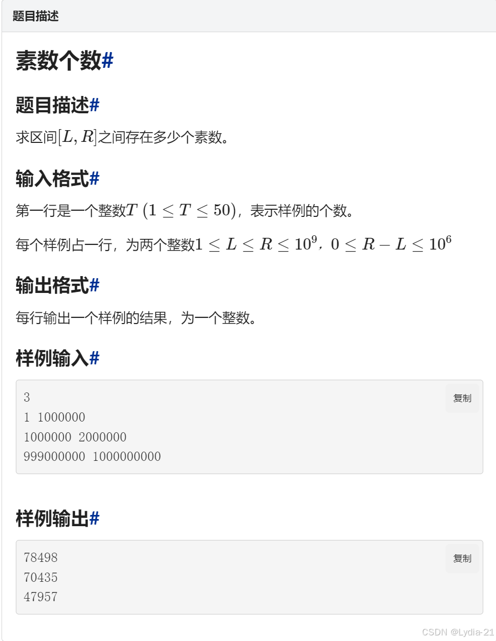 输入:L, R(R ≤ 1e9, R-L ≤ 1e6)