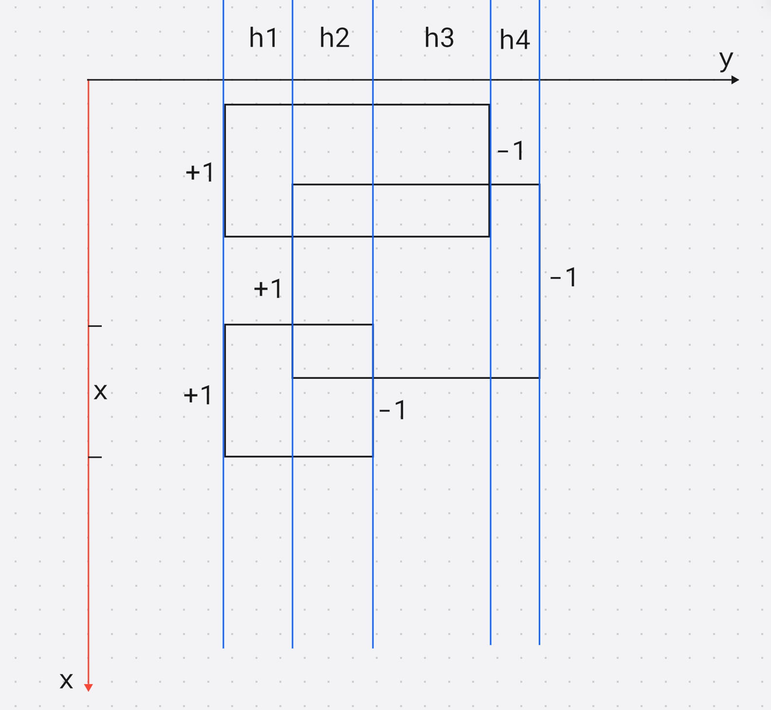 modify(1, find(s.y1), find(s.y2) - 1, s.val);