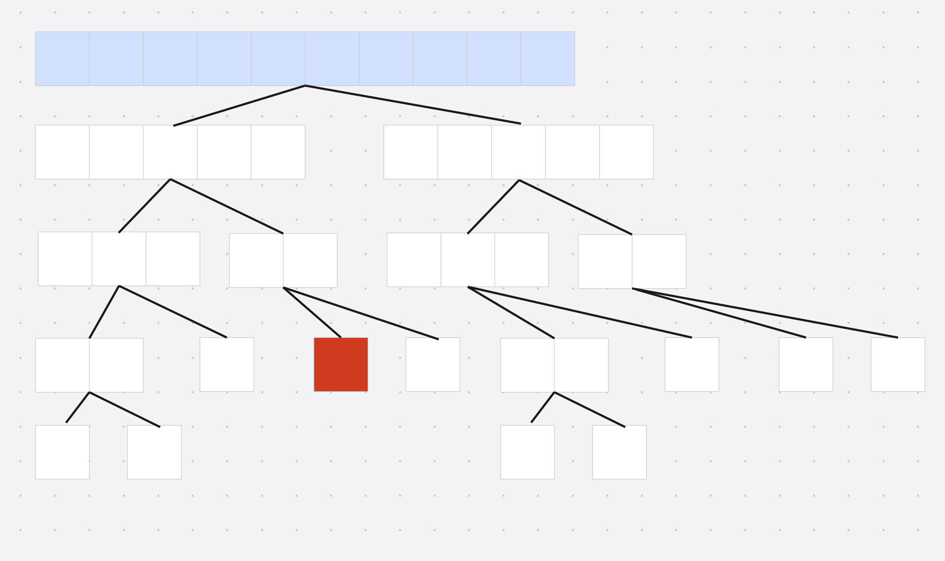 具体的来说, 假设线段树修改到了上面红色的节点(子节点), 但是每次查询只查询根节点(蓝色), 只会用到根节点的两个子节点 的信息