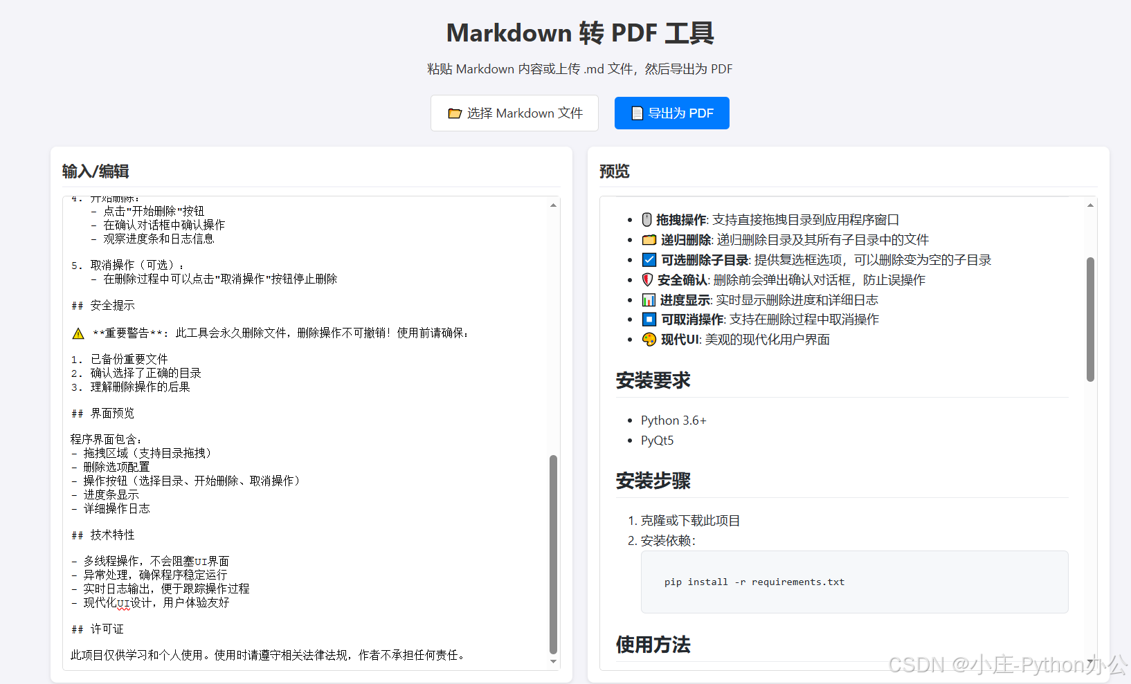 在日常工作和学习中,我们经常需要将 Markdown 笔记转换为 PDF 文档以便分享或打印。虽然市面上有许多工具,但它们往往需要安装庞大的软件或依赖复杂的后端服务。