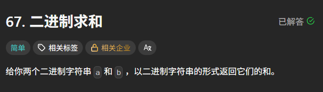 在高精度场景中,二进制求和与十进制高精度加法的核心逻辑完全一致 ------ 本质都是「按位对齐、逐位运算、处理进位」,区别仅在于进制规则(二进制满 2 进 1,十进制满 10 进 1)。下面以力扣 67 题为例,详细拆解高精度二进制求和的实现原理和步骤。