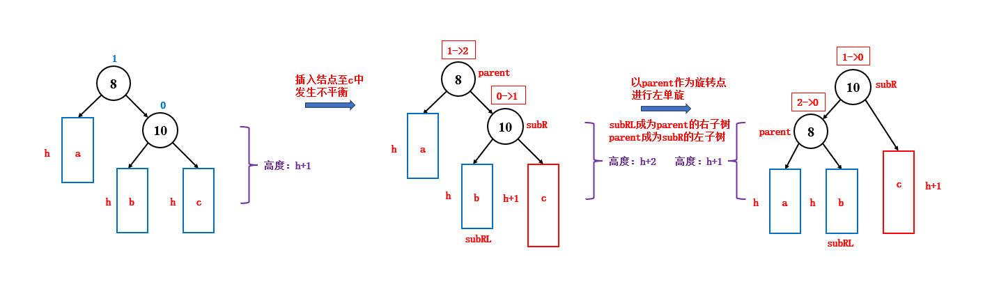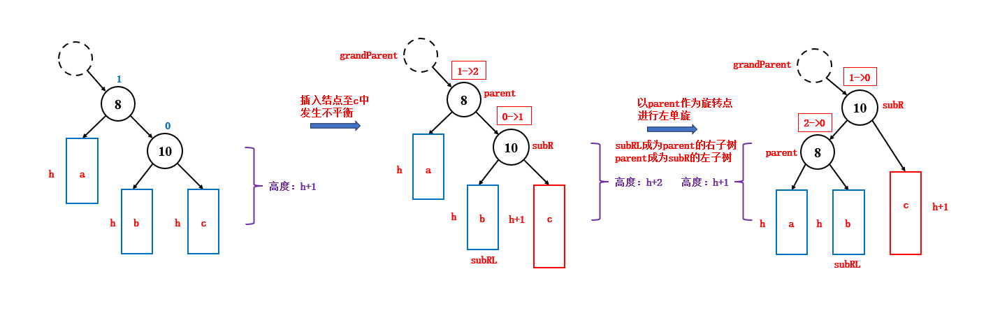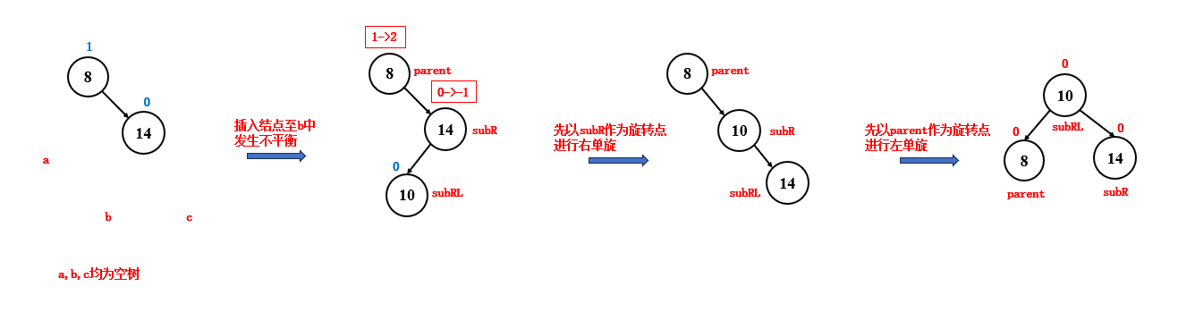 subRL 的平衡因子,说明了新结点插入到了 b 中还是 c 中,会直接影响到最后 parent,subRL,subR 的平衡因子,因为 b 和 c 这两棵子树旋转后的位置是不一样的