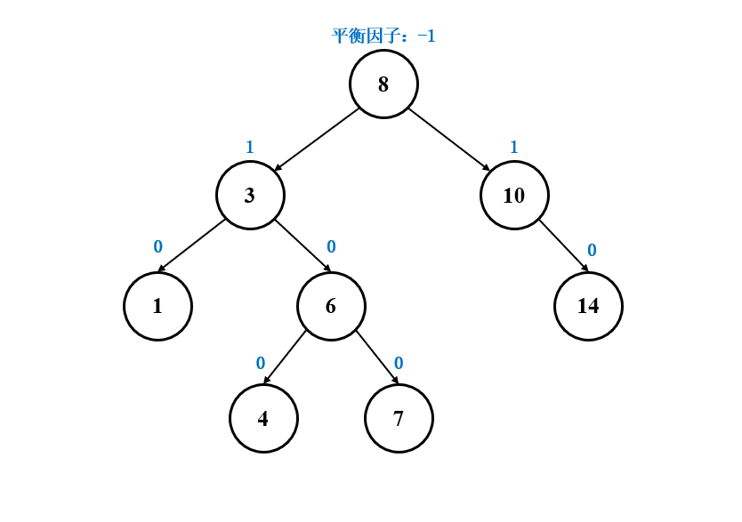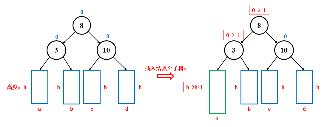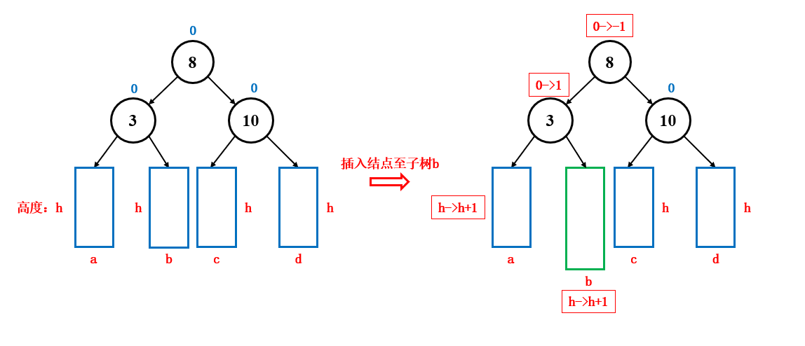 插入完成之后,由于子树中多了一个结点,所以要对父结点平衡因子进行修改,修改时,在这里采用右子树高度 - 左子树高度的方式: