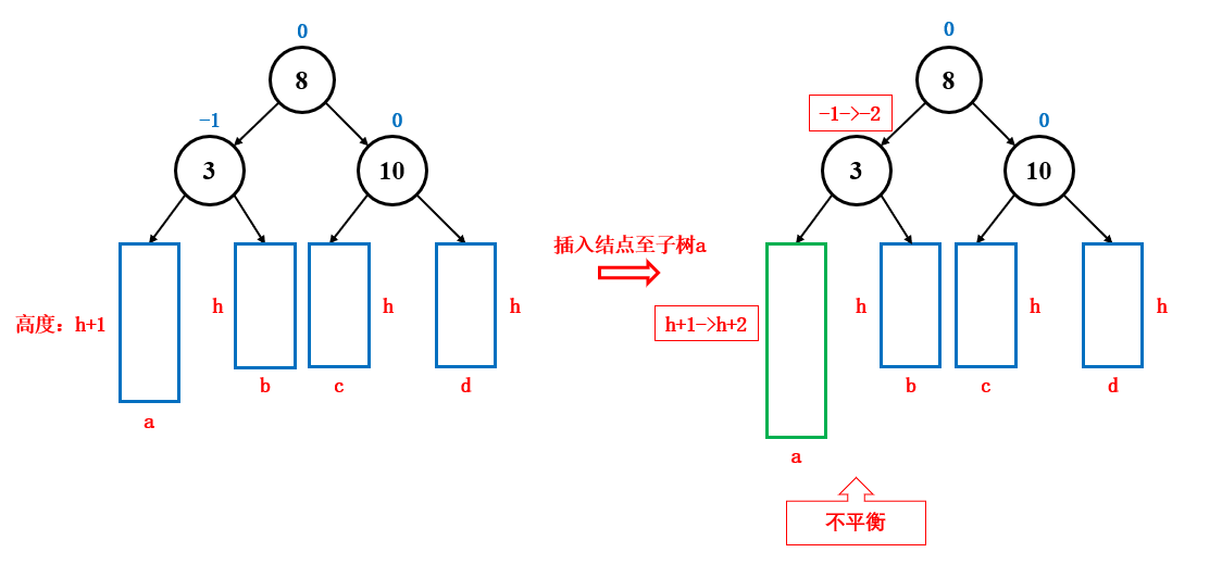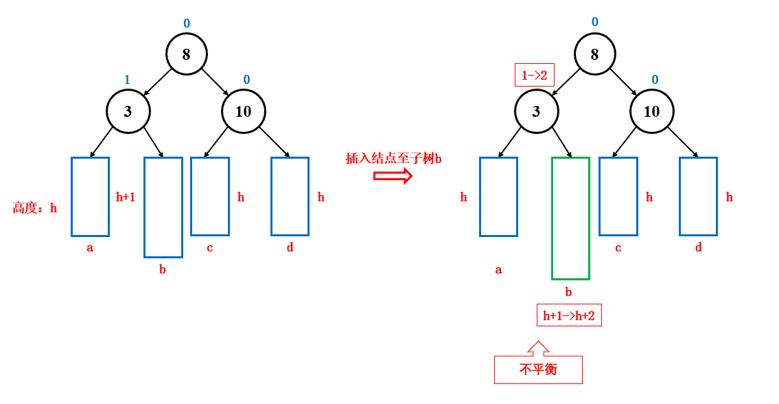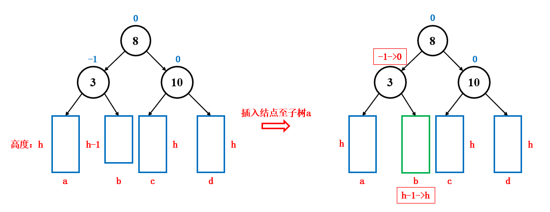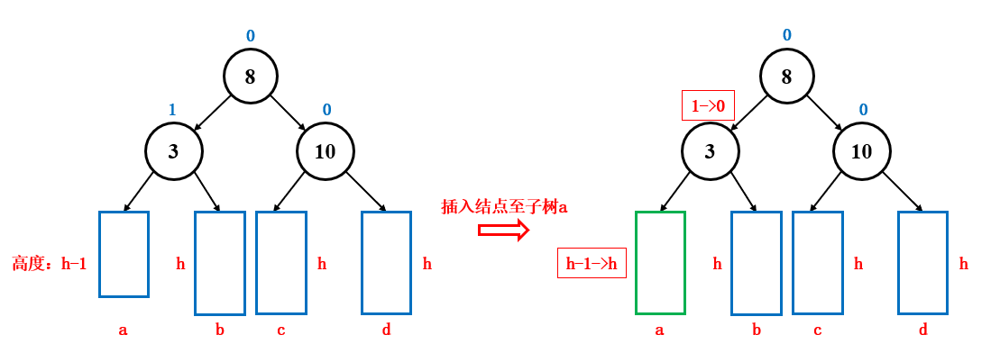 - 右子树****中新增一个结点,右子树高度加一,左子树的高度不变,那么平衡因子就需要 加一