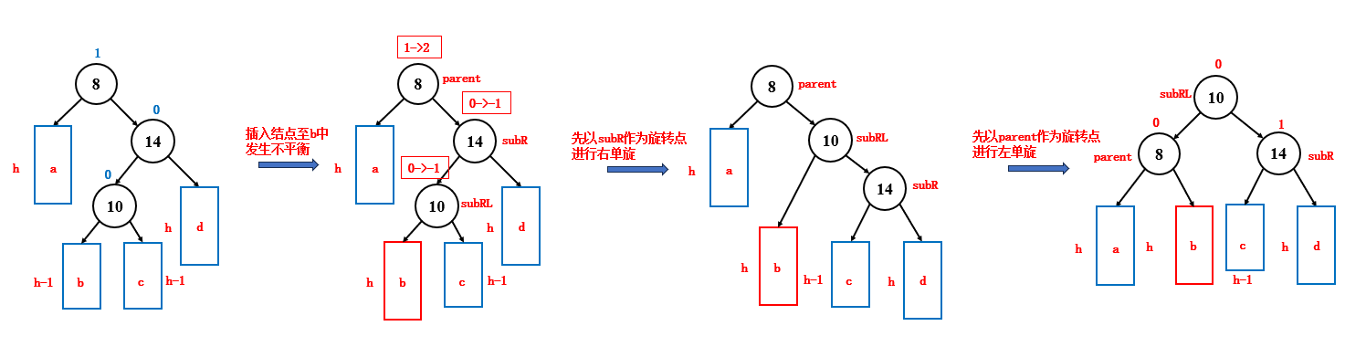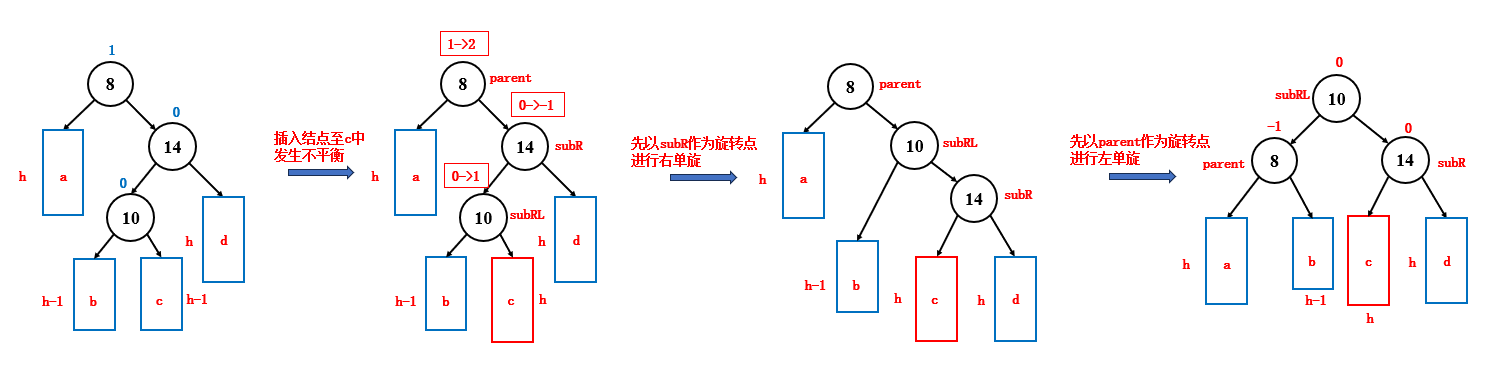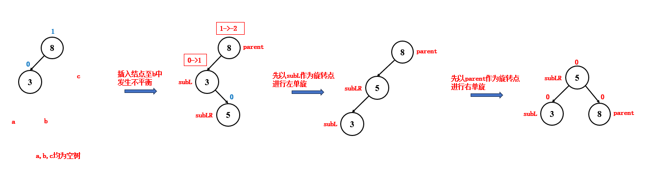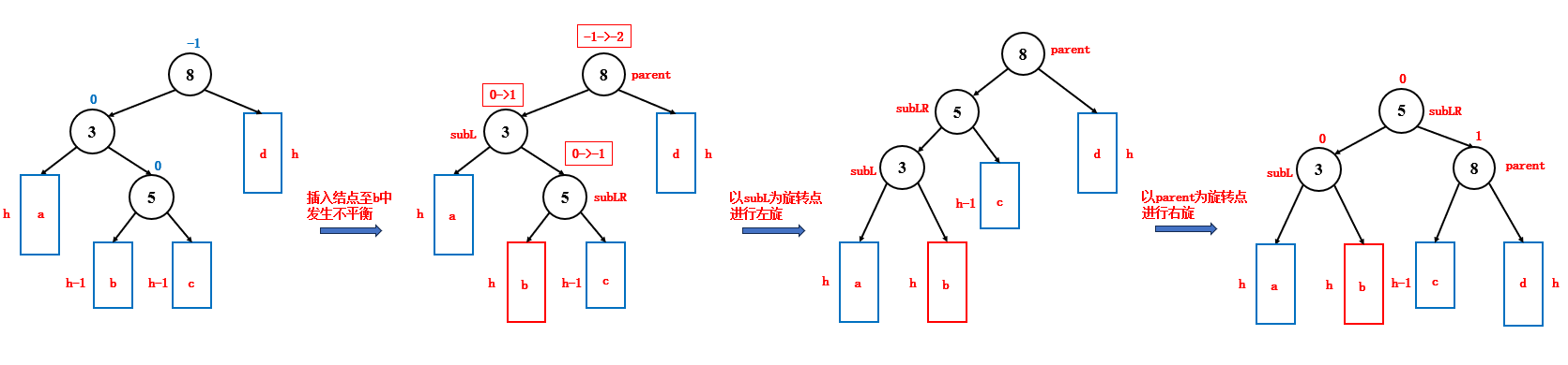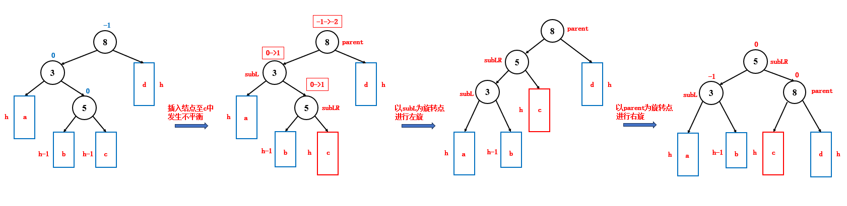 subLR 的平衡因子,说明了新结点插入到了 b 中还是 c 中,会直接影响到最后 parent,subLR,subL 的平衡因子,因为 b 和 c 这两棵子树旋转后的位置是不一样的