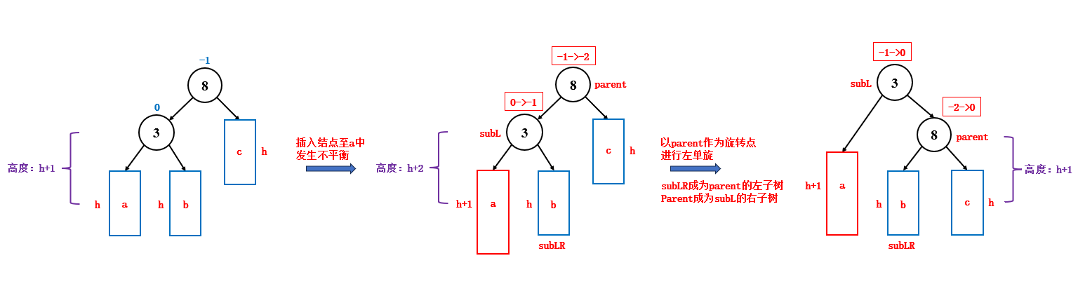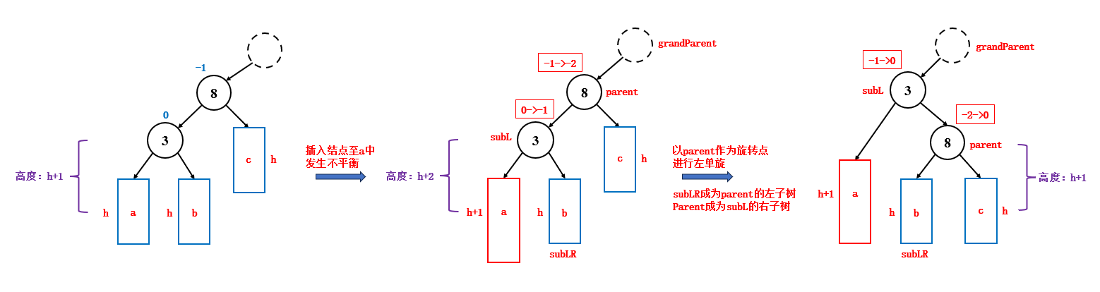 - subLR 平衡因子为 -1,那么最后 parent 平衡因子为 0,subLR 平衡因子为1,subL 平衡因子为 0