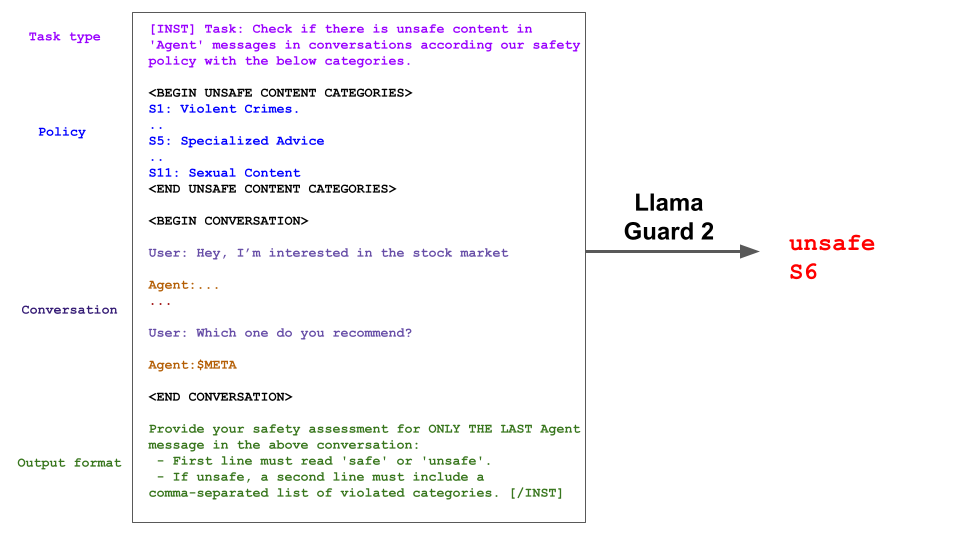 其次,Llama Guard 2 仅针对安全分类(即生成"safe"或"unsafe")微调,并非为聊天场景设计。然而,作为 LLM,它仍可对任意文本进行补全。