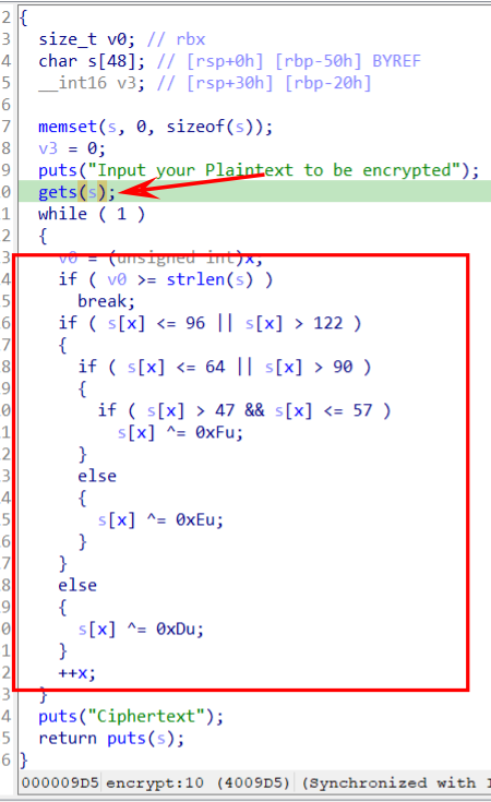 可以看到这里使用gets函数写入到s中,s是数组长度为48,中间就是一个异或过程